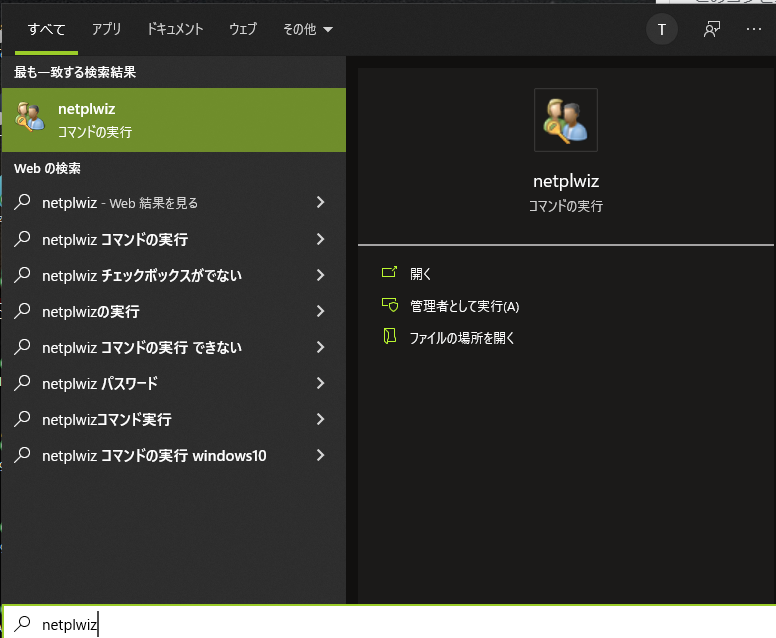 画面下の検索画面から「netplwiz」と入力します。検索結果に 「netplwiz」 が表示されるので、そのまま 「Enter」キーを押します。