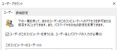 表示された画面で「このコンピューターのユーザー」から自動サインインしたいユーザー名 をクリックします。その上にある「ユー ザーがこのコンピューターを 使うには」のチェックを外し、「OK」をクリックします。